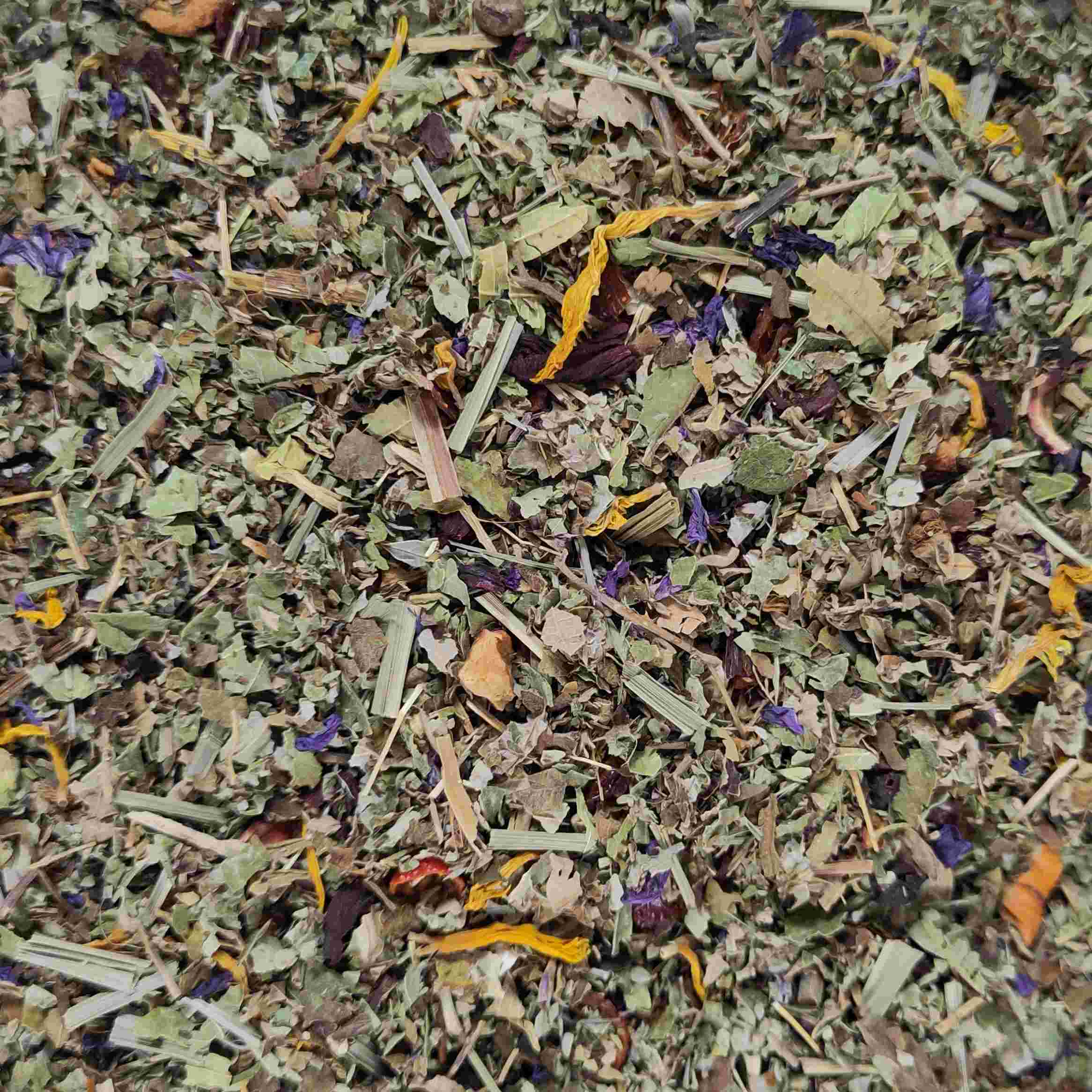 Bunte Vielfalt sorgfältig ausgewählter  Bio-Kräuter vereint in einer Tasse Tee.