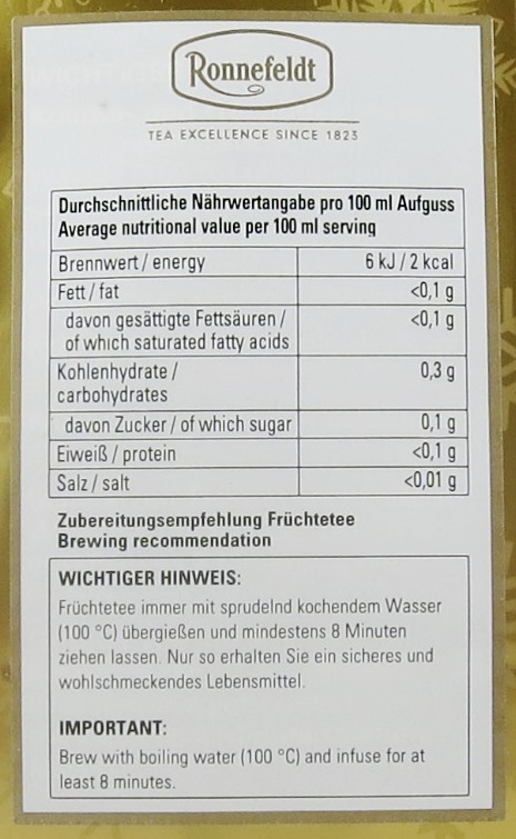 Aromatisierter Früchtetee mit Vanillekipferl-Mandelgeschmack. Milder Früchteteefür einen weihnachtlich-festlichen Genuss.
